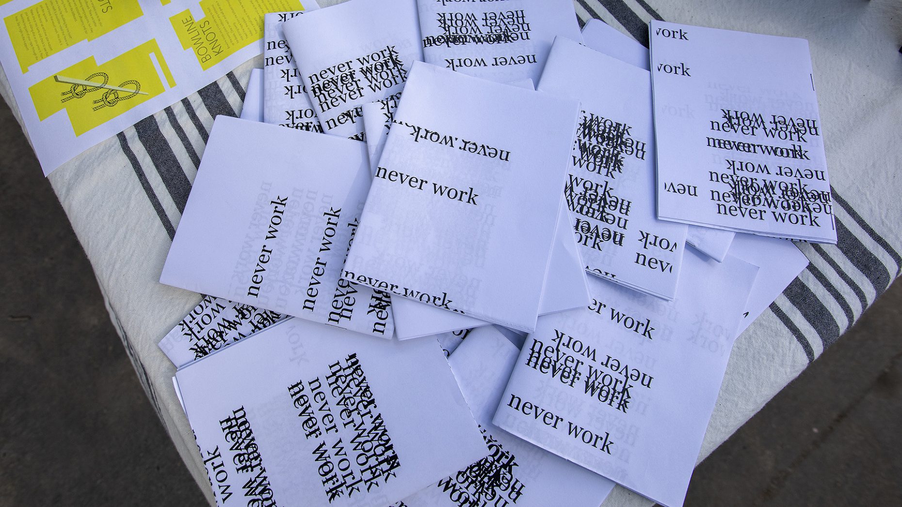 Like a number of performances and interventions from this period, this work playfully engages with the language and broader implications that underpin plurality and solidarity. This work explores a peculiar philosophical position, a bizarre synthesis of divergent influences, whose ultimate aim is the liberation from labor with minimal concern for those consequences associated with that liberatory model.