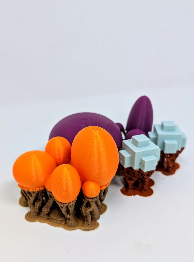 Simple 3D shapes are placed outside of the printable range on a Prusa 3D printer. The “organic” support structure weaves ‘wooden’ PLA into roots, stumps, and vines to hold up the plastic.
